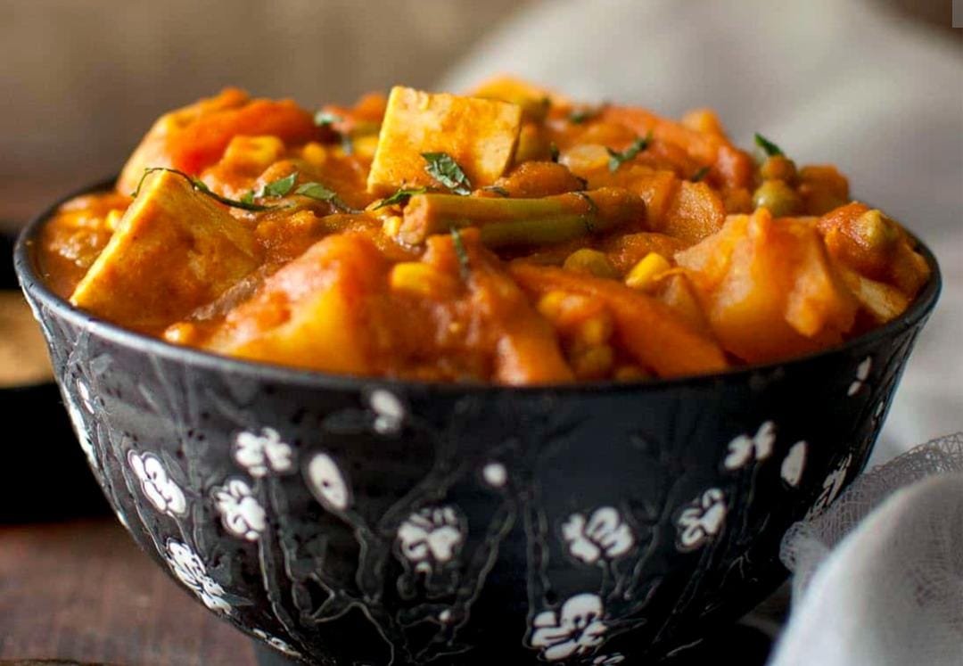 Goan vegetable vindaloo is a spicy and tangy vegan curry that is an adaptation of the traditional Portuguese-influenced meat dish. It features a rich, vinegary, and garlic-infused spice paste combined with hearty vegetables like mushrooms, potatoes, and cauliflower.